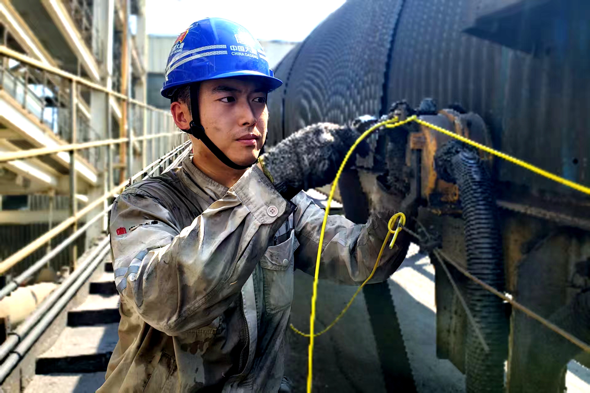 他們熟練地安裝上新的拉繩開關(guān),反復(fù)核對接線圖后將信號線牢固地接到端子上。“遞下新拉繩?!彪S著一聲呼喊,未紀牢迅速將新拉繩遞上去。他們默契配合,讓一卷拉繩舒展身軀沿著皮帶機架穿過一個又一個固定環(huán),并且逐一固定到拉繩開關(guān)上,確保每個間距的卡扣牢固緊實、拉繩松緊度恰到好處。盡管滿臉煤灰、渾身濕透,他們依舊有條不紊地推進著,每個人的眼中都透露出必勝的決心。當最后一道卡扣鎖緊時,整條拉繩如琴弦般筆直繃緊。