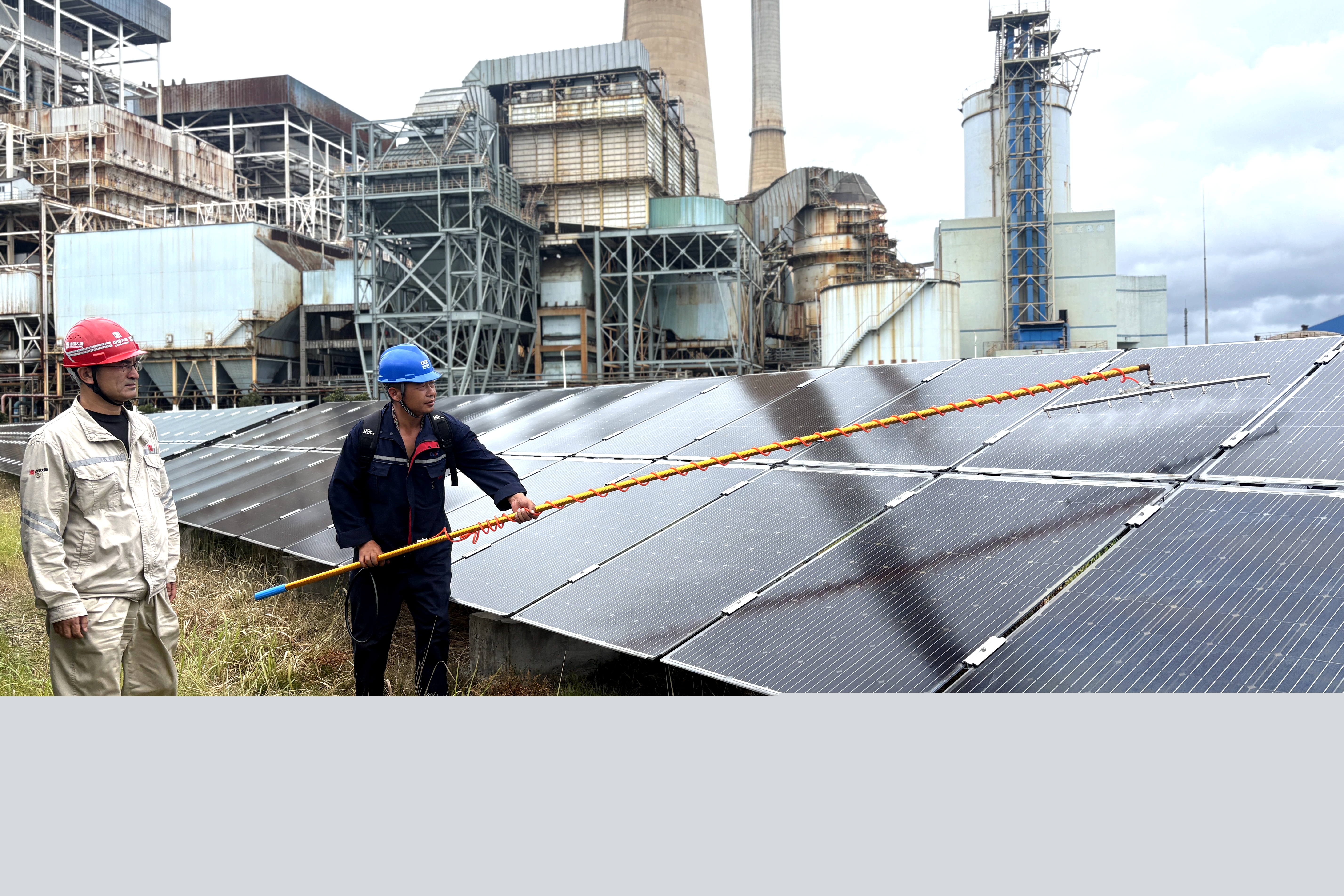 浙江新能源公司烏沙山廠區(qū)光伏電站位于火電廠生產(chǎn)區(qū)域二期場地,這里常年彌漫著白色蒸汽。蒸汽遇冷凝結(jié)后,會形成“石膏雨”,在光伏板表面結(jié)成水漬般的污垢。過去,該公司采用“人工+機器人”的清潔方式,往往剛清洗完畢,“石膏雨”便又隨之落下,最多三天,光伏板就會和未清洗時一樣。不僅如此,每次清潔時必須使用專用清洗劑,每塊光伏板要清洗5遍以上,但“細心呵護”后發(fā)電效率依舊不理想。“組件清洗就是治標不治本,不加以重點防治,清洗也是徒勞。”寧波區(qū)域運維中心主任曹魯心感慨道。