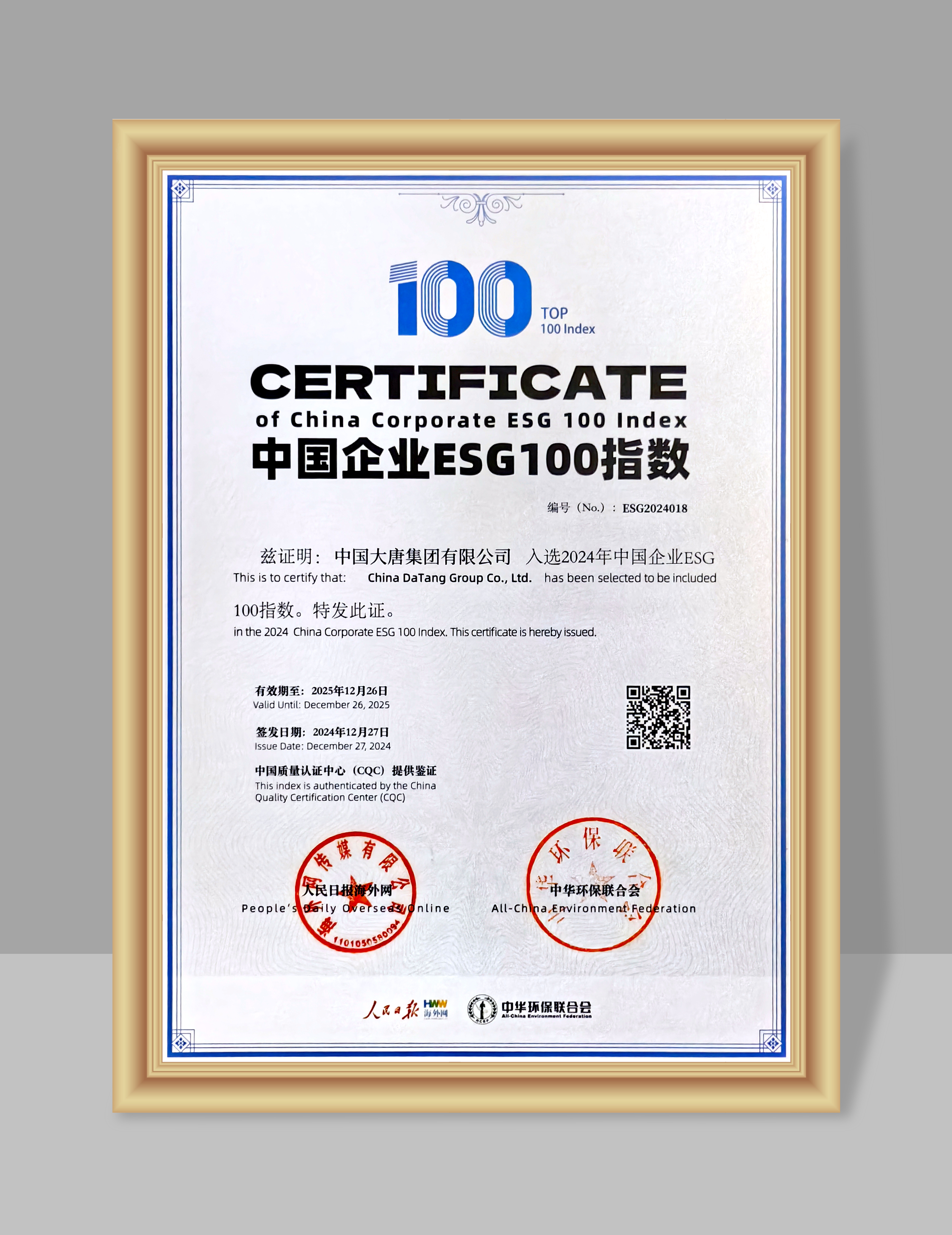 China Datang?has recently been honored with inclusion in the "2024 China Corporate ESG 100 Index"?at "The 2nd China Brand Global Image Communication Forum and the 2024 China Corporate ESG Blue Book Launch Event", co-hosted by the People's Daily Online and the All-China Environment Foundation.